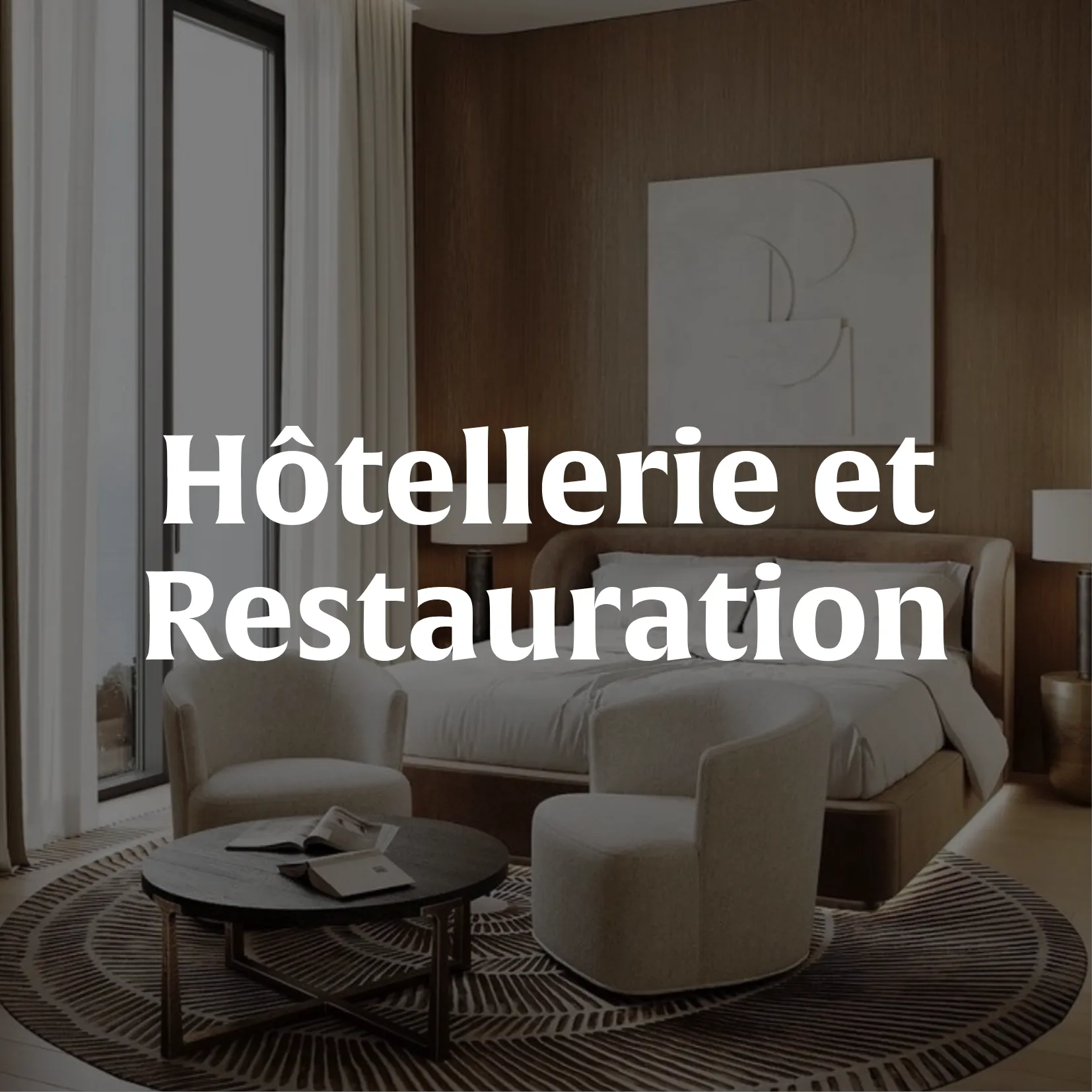 - Le mobilier : lits, literie professionnelle, têtes de lit, canapés, fauteuils, tables, chaises, rangements, bureaux, mobilier de salle de réunion, mobilier de lobby